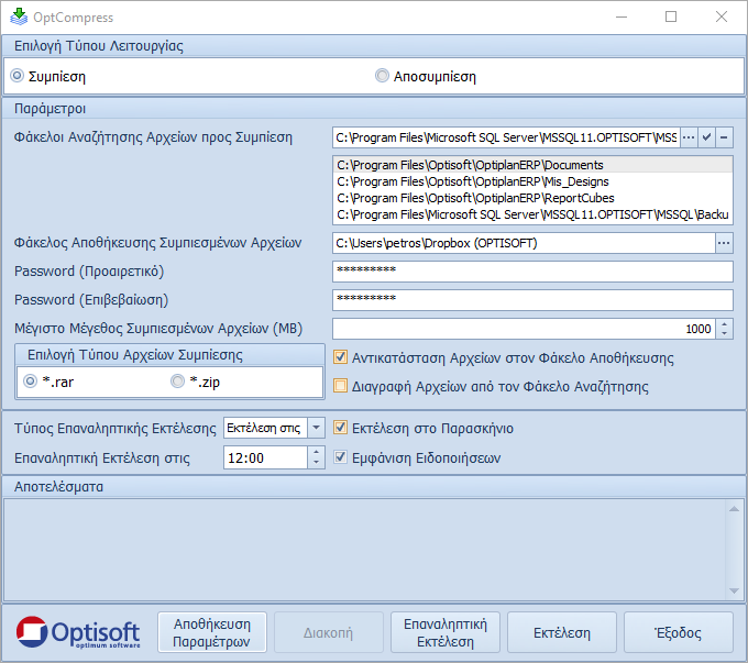 - Επιλογή τύπου συμπίεσης αρχείων (π.χ. .zip, .rar)